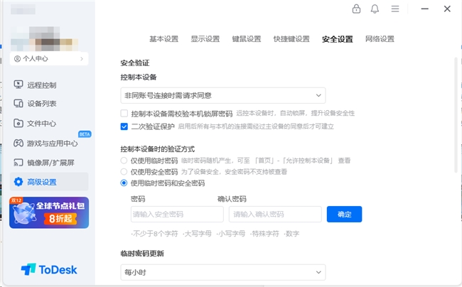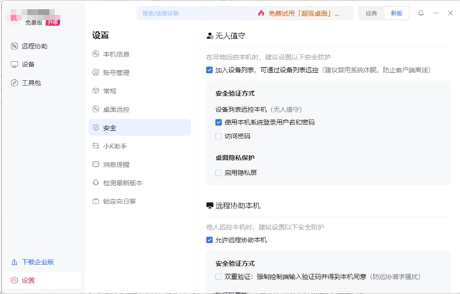 ● 全方位安全体系:采用端到端加密连接,专属设备代码每机一个,临时密码支持调整更新频率;设有二次验证保护、校验锁屏密码、结束远控自动锁屏、开启黑白名单管理等,堪称行业内安全大王。